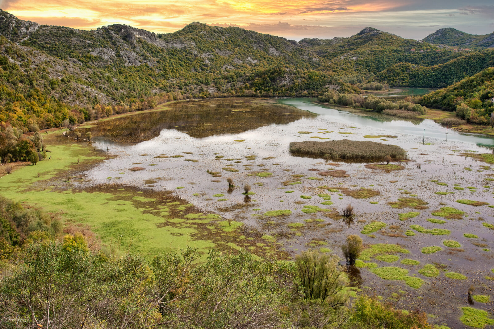Der Skutarisee – oder Skadarsko Jezero, wie er auf Serbisch heißt – ist der größte See der Balkanhalbinsel und liegt zu etwa zwei Dritteln auf montenegrinischem Staatsgebiet, der Rest gehört zu Albanien. Schon bei der Anreise über die kurvenreichen Straßen offenbart sich sein Zauber: sanfte Hügel, üppige Vegetation und immer wieder dieser weite Blick über das Wasser, das sich in unzähligen Schattierungen von Blau, Grün und Gold zeigt – besonders im weichen Licht des Herbstes.