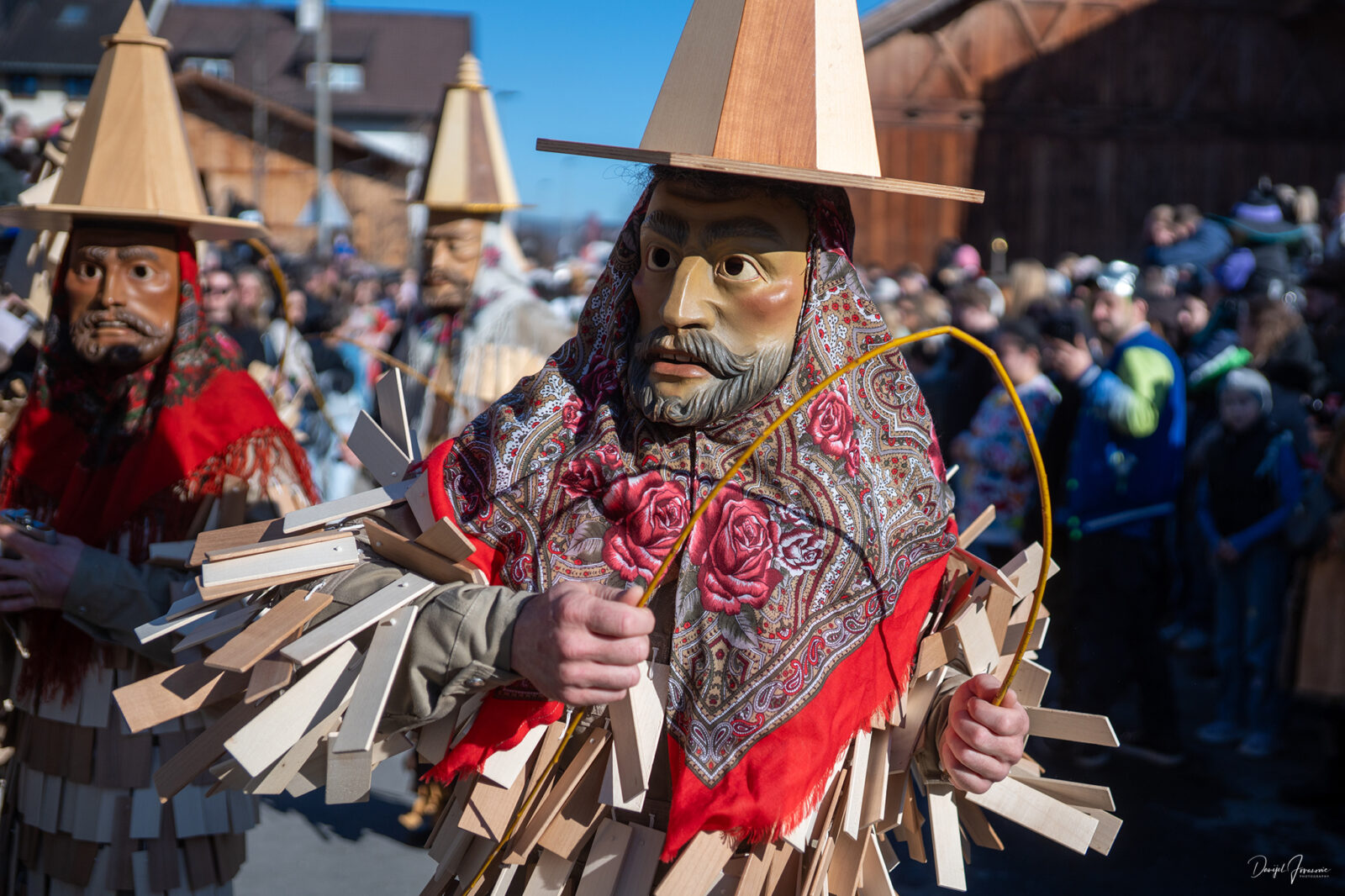 Gegenläufig dazu stehen die Herbst- und Winterfiguren: Zaggeler, Fleckler und Zottler. Sie tragen dunkle, zottige Kostüme mit Fransen und Fellbesatz und tanzen zu donnerndem Rhythmus. Der Zaggeler etwa hat ein blaues Gewand mit rund hundert bunten Quasten („Zaggelen“), vielen Glocken und etwa einhundert Hahnenfedern im Busch seines Huts. Mancher Zaggeler offenbart sogar einen Spiegel im Hut – die gleiche Symbolik, mit der die Winterdämonen schließlich in die Flucht geschlagen werden sollen. Der Fleckler ähnelt dem Zaggeler, ist aber noch bunter gefleckt und trägt statt Kaninchenfell einen Fuchsschweif am Hut.