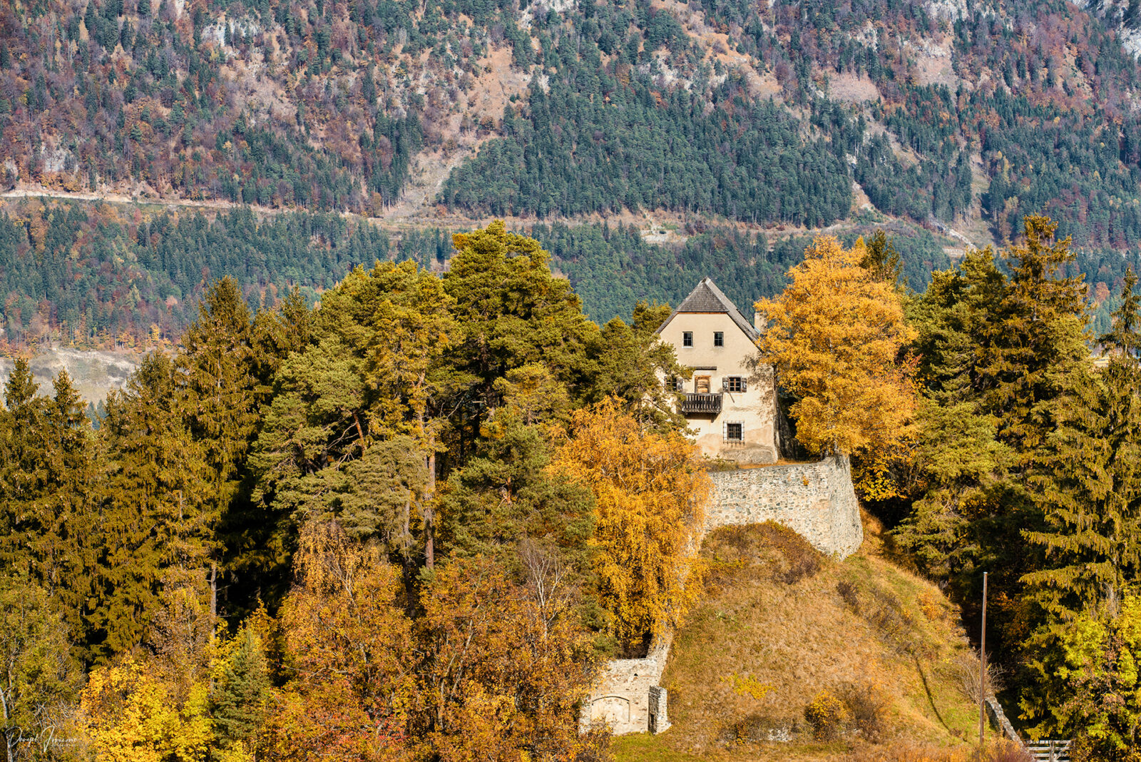 Unser letzter Stopp führt ins Oberinntal – zur Burg St. Petersberg bei Silz, einem meiner Herbstfavoriten. Die Burg thront auf etwa 770 m Höhe (rund 70 m über dem Talboden) und ist über einen malerischen, aber leichten Rundwanderweg erreichbar. Die Burg St. Petersberg wurde erstmals 1244 erwähnt, mutmaßlich von Herzog Welf II. errichtet und später von Graf Meinhard II. ausgebaut – mit Verlegung des Gerichtssitzes dorthin.